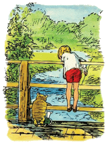 Լայն արահետը, որը, թերեւս, կարելի էր ճանապարհ անվանել, Անտառ էր գալիս Արտաքին Աշխարհից, բայց նախքան Անտառ մտնելը պետք է անցներ Գետի վրայով։ Եվ այնտեղ, ուր Ճանապարհն ու Գետը հանդիպում էին, փայտե կամրջակ կար, համարյա նույնքան լայն, որքան ճանապարհը, եւ երկու կողմից փայտե ճաղաշարք ուներ։ Քրիստոֆեր Ռոբինը, եթե ուզենար, կարող էր ծնոտը հենել վերին ճաղաշարին․ բայց շատ ավելի հետաքրքիր էր կանգնել ներքեւի ճաղաշարի վրա ու կռացած նայել առանց շտապելու ինչ֊որ տեղ գնացող գետին։ Վինի֊Թուխը, եթե ուզենար, կարող էր ծնոտը հասցնել ներքեւի ճաղաշարին, բայց շատ ավելի հետաքրքիր էր գլուխը մտցնել ճաղաշարի տակ եւ փորին պառկած նայել դանդաղ հոսող Գետին։ Իսկ Դնչիկի ու Ռուի համար դա Գետով սքանչանալու միակ հնարավոր ձեւն էր, որովհետեւ նրանք այնքան փոքրիկ էին, որ ոչ մի կերպ չէին կարող հասնել նույնիսկ ներքեւի ճաղաշարին։ Նրանք պառկում էին ճաղաշարի տակ եւ Գետին նայու… Իսկ Գետը հոսում էր, դանդաղ ու հանդարտ՝ չէ՞ որ շտապելու բան չուներ․