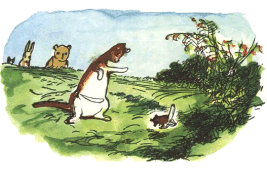 — Ճագարը եւ Դնչիկը, որ այդ նույն պահին հայտնվեցին բլուրի մյուս կողմից, նույնպես ասացին «բարի օր» եւ «ողջույն, Ռու», իսկ Ճստիկ Ռուն հրավիրեց դիտելու, թե ինչպես է ինքը ցատկում…