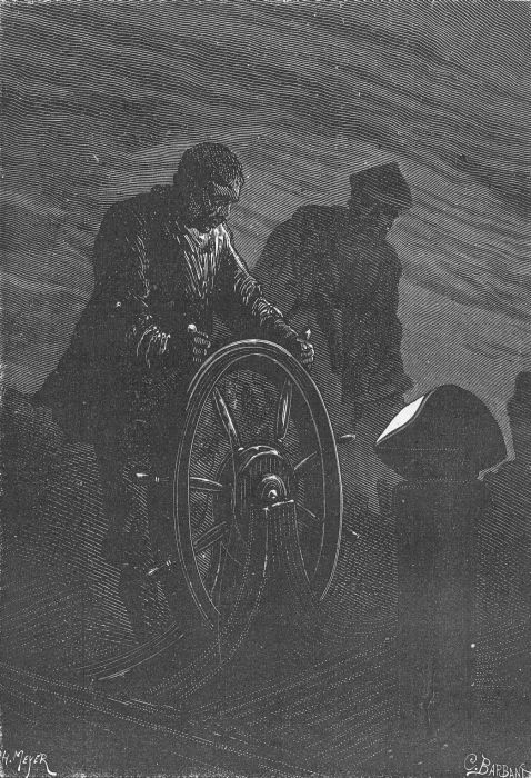 Նավախելում կողմնացույցի արկղիկը թույլ լույս էր արձակում և մեղմորեն ճառագայթում ղեկի մետաղե անիվի վրա։ Կողային նշանատու լապտերները լուսավորում էին նավից դեպի ծովն ընկած տարածությունը՝ տախտակամածը թողնելով խոր մթության մեջ։