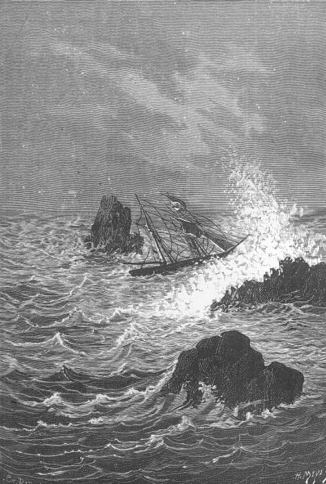 Առագաստանավի առաջ երևում էր ծովափնյա խութերի մի երկար շարան, որոնց խփվելով՝ փրփրում էր սպիտակած ծովը։ Ալիքները հասնում էին մինչև ցամաք։ Ըստ երևույթին, ահռելի ալեկոծություն էր այնտեղ։
