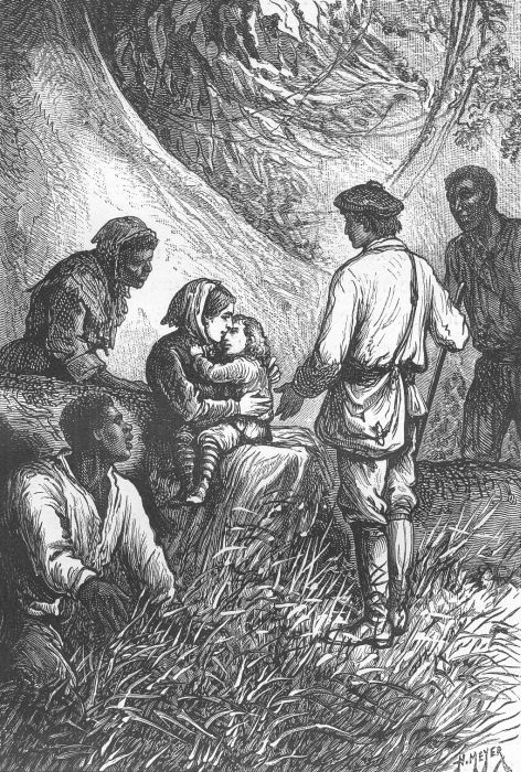 Տիկին Ուելդոնը նայում էր առանց տեսնելու։ Դիկ Սենդը դողում էր՝ մտածելով, որ դեռատի կինը կարող էր հարցեր տալ, իսկ պատանին հույս ուներ, որ նրան ծովափ կհասցնի՝ առանց հայտնելու, թե Հարրիսի դավաճանությունը իրենց մոլորեցրել էր աֆրիկյան մի նահանգում։ Բարեբախտաբար, տիկին Ուելդոնը իրեն հաշիվ չէր տալիս իր շուրջր տեսածի մասին։ Նա ինքը ուզեց գրկել երեխային, և քնած փոքրիկ Ջեկը կլանում էր նրա ամբողջ ուշադրությունը։ Նանը քայլում էր նրա կողքից, և ո՛չ մեկը, ո՛չ մյուսը պատանուն չտվեցին այն սոսկալի հարցերը, որից նա այնքան վախենում էր։ Իսկ ծերունի Թոմը գնում էր աչքերը գետնին հառած՝ նա շատ լավ էր հասկանում, թե ինչու անտառի այդ ուղու վրա մարդկային ոսկորներ են թափված։