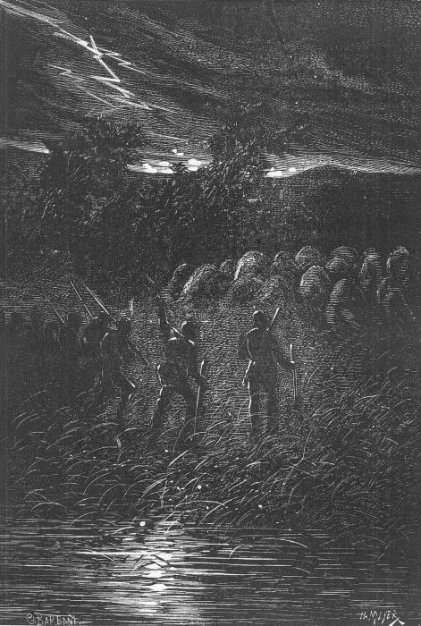 Քայլելը դժվար էր։ Ակտեոնը պինդ բռնել էր կուզեն Բենեդիկտին։ Թոմը օգնում էր Նանին, որը առանց նրա աջակցության կխրվեր տիղմի մեջ։ Մյուս երեք նեգրերը պատգարակն էին տանում։ Դիկ Սենդը խմբի առջևից գնալովք՝ հողն էր զննում։ Շատ դժվարությամբ ոտք դնելու տեղ էին գտնում․ պետք էր քայլել խիտ և կոշտ խոտերով ծածկված եզերքով, բայց հաճախ հենակետը փախչում էր ոտքի տակից, և մինչև ծունկը խրվում էին տիղմի մեջ։
