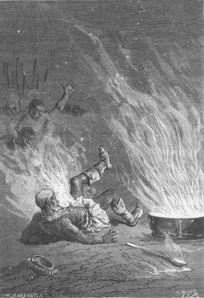 Ալվեցը մետաղե մեծ շերեփը ձեռքին՝ խառնում էր հեղուկը, որը դժգույն ցոլքեր էր արձակում այդ խելահեղ կապիկների վրա։