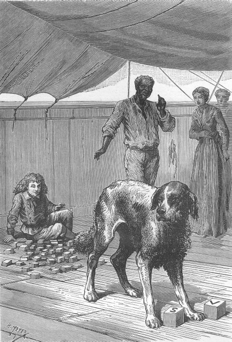— Ոչ, այդ միայն իմ ենթադրությունն է, տիկին Ուելդոն,— պատասխանեց նավապետ Հուլը։— Սակայն փաստ է, որ Դինգոն ճանաչում է «Ս» և «Վ» տառերը, որոնք, իրոք, ֆրանսիացի ճանապարհորդի անվան և ազգանվան սկզբնատառերն են։ Իսկ թե ինչ պայմաններում է այս անասունը սովորել դրանք տարբերել մյուս տառերից, այդ ես չեմ կարող բացատրել, բայց կրկնում եմ, Դինգոն դրանք ճանաչում է անվիճելիորեն և տեսեք, նա հրում է թաթով և կարծես մեզ հրավիրում է կարդալ այդ տառերը իր հետ։