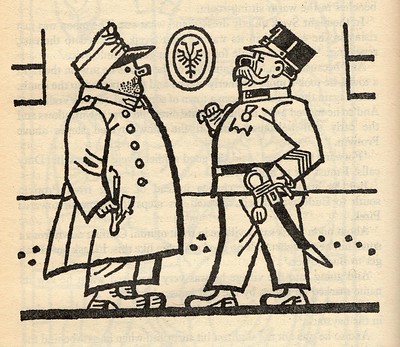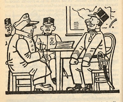 — Դատեցեք ինքներդ, մեր դրոշների տակ են աշխարհազորական ուլանները, ավստրիական աշխարհազորականները, բոսնիական եգերները, ավստրիական հետևակը, հունգարական հետևակը, հունգարական հետիոտն հոնվեդները, հունգարական հուսարները, աշխարհազորական հուսարները, հեծյալ եգերները, դրագունները, ուլանները, հրետանին, գումակը, սակրավորներ, սանիտարները, նավատորմը։ Իսկ Բելգիան ի՞նչ ունի։ Առաջին և երկրորդ զորակոչի ենթարկվածները կազմում են բանակի օպերատիվ մասը, երրորդ զորակոչի կազմը ծառայում է թիկունքում…— Կապիտան Սպիրոն ձեռքը խփեց սեղանին։— Խաղաղ ժամանակ աշխարհազորը ծառայում է երկրի ներսում։