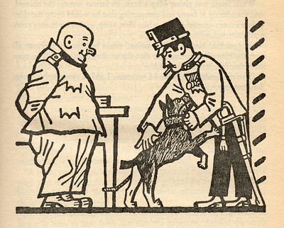 Պորուչիկի այն հարցին, թե Շվեյկը որտեղից է գտել շանը և նրա համար որքան է վճարել, Շվեյկը հանգիստ պատասխանեց, թե այդ շունը իրեն նվիրել է մի բարեկամ մարդ, որին հենց նոր բանակ են կանչել։